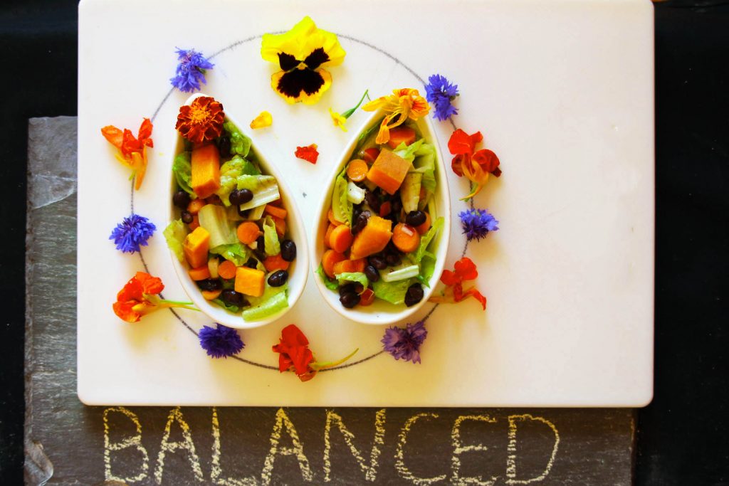 Balanced Romaine, Black Bean, Sweet Potato Salad Medley with Chipotle Vinaigrette.