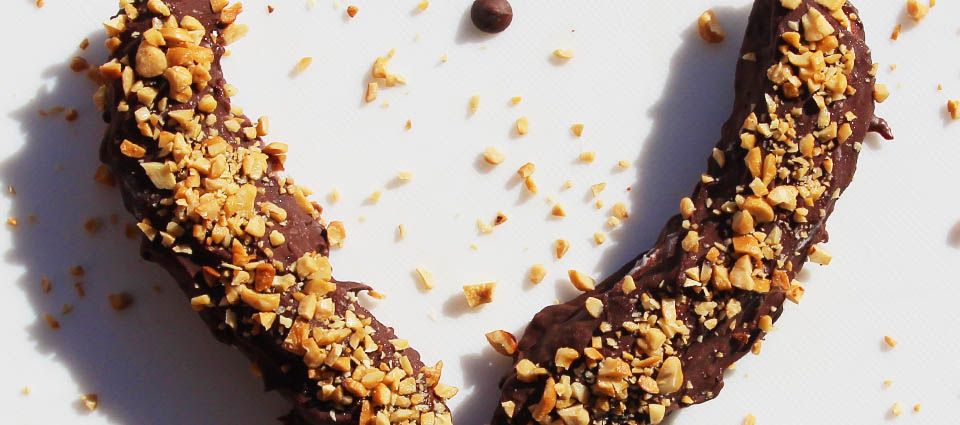 Line a baking sheet with parchment paper. Gently melt chocolate in a double-boiler (to make your own double-boiler, place a metal bowl over a pot of simmering water) and simply dip your banana into the chocolate. Then gently roll into chopped cashews. Gently slide a popsicle stick into the end of the banana (if you have one and want to eat your banana like a popsicle)! Place the coated bananas onto your baking sheet and into the freezer. Enjoy your popsicles of goodness!