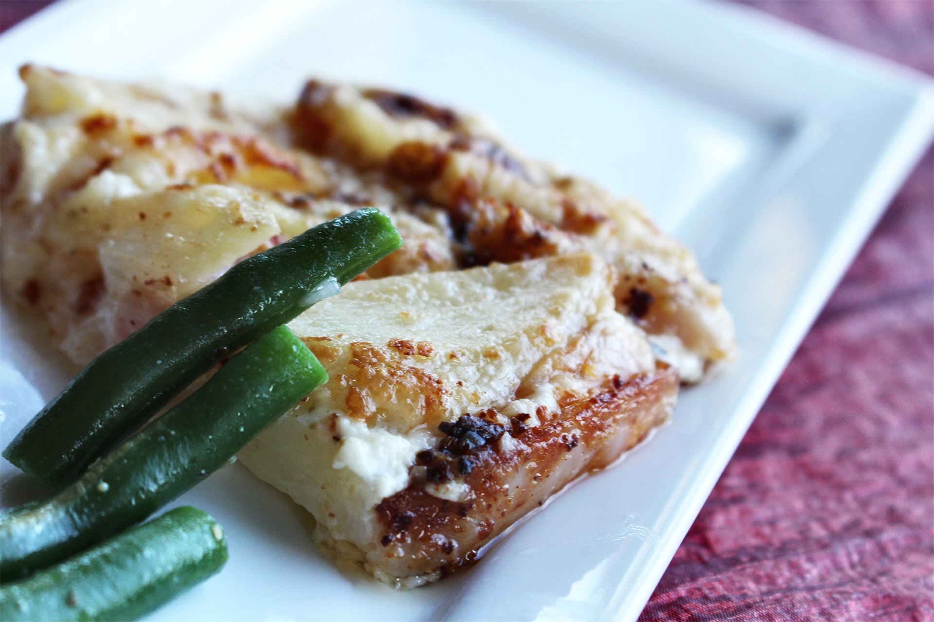 Heat the cream, VERY GENTLY, until butter begins to appear. Immediately pour the cream over the potato layers. It should come up the side of the pan about halfway, add milk if needed.