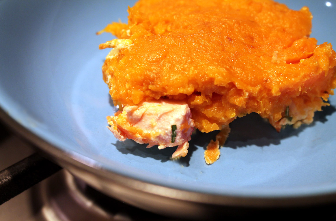 Salmon is a nice and healthy alternative to beef in Shepherd’s Pie. Why not include salmon, a great source of ‘brain food’ for your family when you can! The salmon flavor is very mild and is a perfect fit with the sweet potatoes.