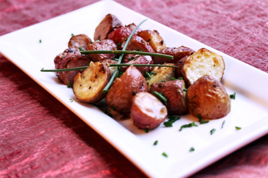 Roast until potatoes are browned and tender for 15 to 20 minutes 15 Minutes. Turn potatoes after about 10 minutes 10 Minutes . Remove from oven, garnish with chives and serve.