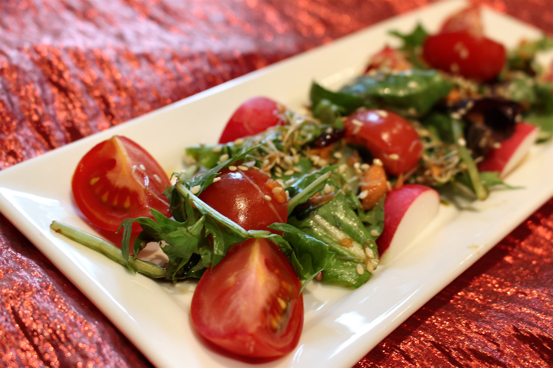 Lightly toast sesame seeds on stovetop in a small skillet. Allow to cool and garnish salad.
