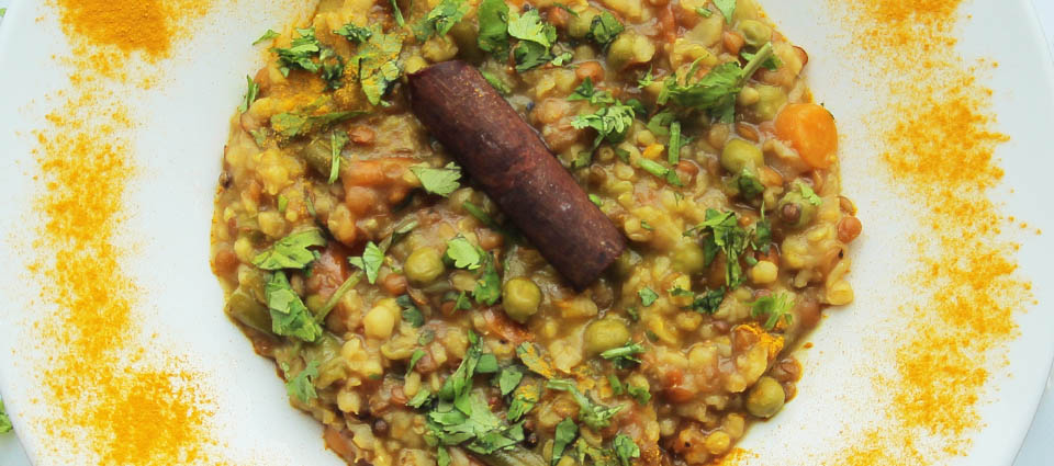 Add the cumin and mustard seeds and fry just until the mustard seeds start to pop. Stir in the coriander, fennel, turmeric, cinnamon stick, and salt/pepper, Grains of Paradise, then add the ginger and tomato. Cook until fragrant, about 2 minutes. Add the rice and stir well to cover the grains of rice. Next add the mung beans, lentils, green beans, peas and water. Bring to a boil, reduce the heat to low, and simmer, covered, until the rice and beans are soft, about 45 minutes. Add more water if the pot becomes dry while cooking or to achieve a more stew-like consistency. Season again with salt/pepper, to taste and serve garnished with cilantro.