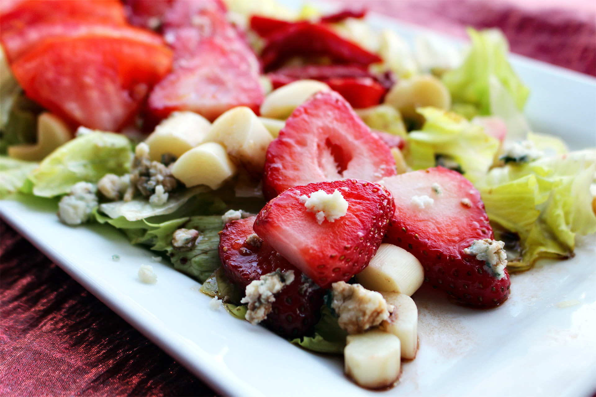Arrange lettuce leaves on individual plates and then arrange hearts of palm, artichokes, tomato, and pepper strips with strawberries on top.