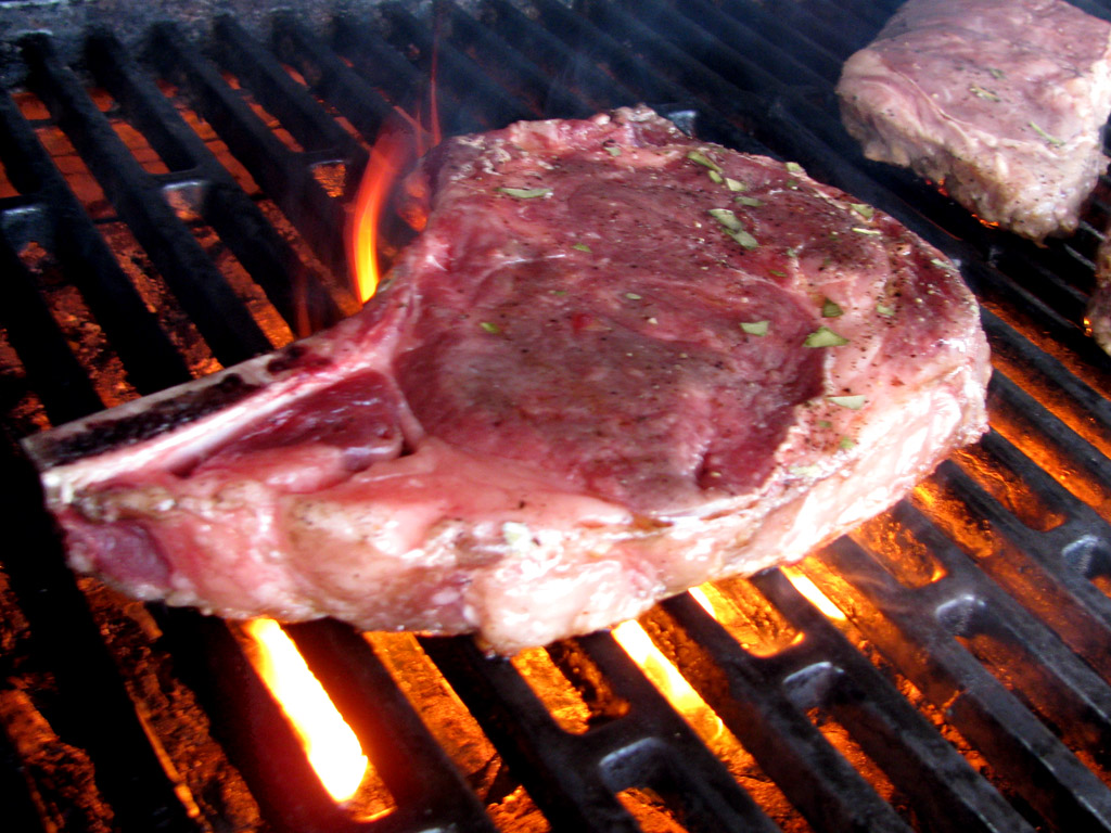 Preheat a grill pan or light a grill. Grill the steaks over moderate heat, turning once or twice, until lightly charred, about 7 minutes for medium-rare meat. Let the steaks rest for 5 minutes, serve with the onion chutney.