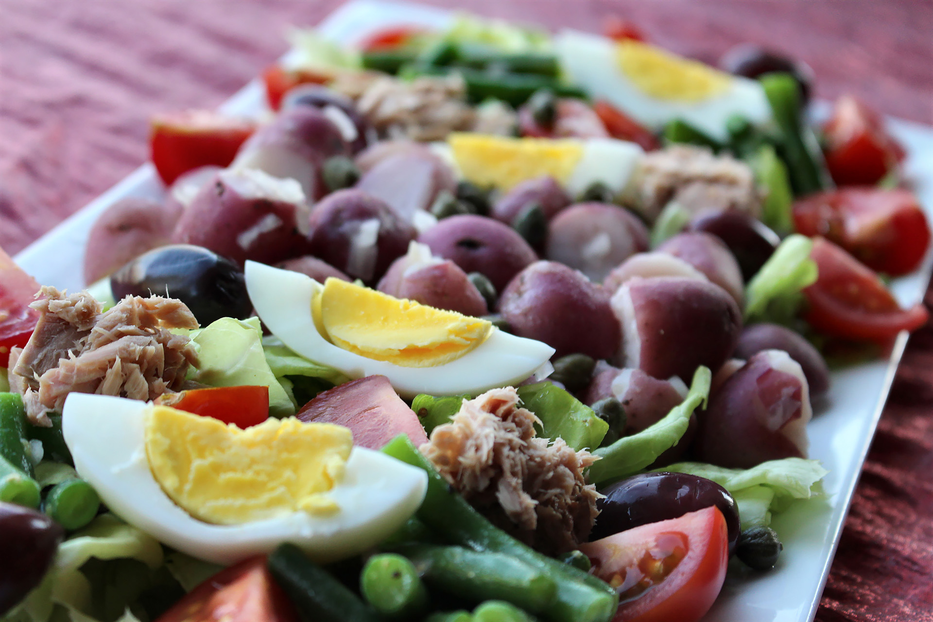 Of all salads, the Niçoise is my all-time favorite, with its fresh butter-lettuce; its carefully cooked, beautiful green beans; its colorful contrast of halved hard-boiled eggs, ripe red tomatoes, and black olives; all fortified by chunks of tuna and freshly opened anchovies.