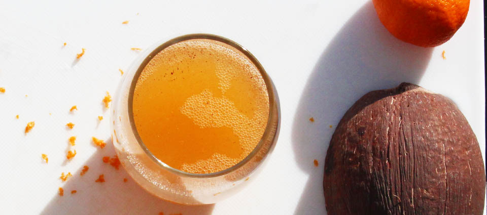 Place the orange juice, coconut water, cinnamon in your blender and blend gently until foamy! Dust with orange zest. Enjoy waking up your body!