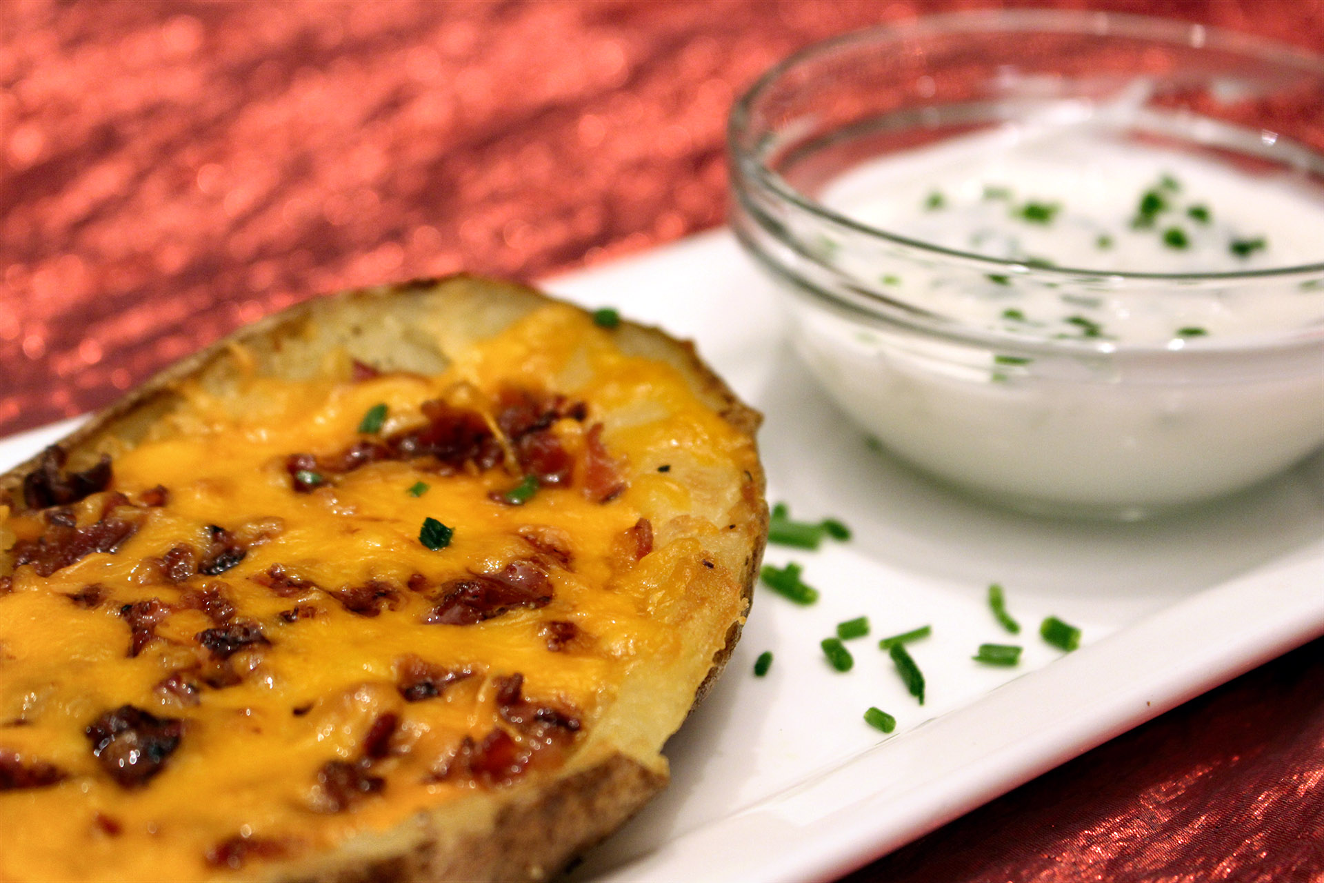 Evenly fill each skin with cheese and crumbled bacon. Broil until the cheese is melted and bubbling, about 4 to 5 minutes.