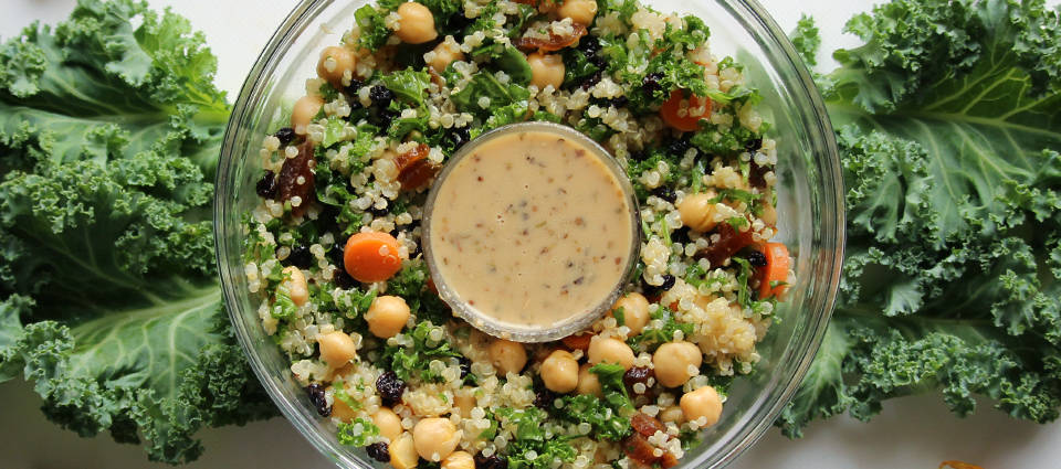 Add quinoa to the bowl along with the chickpeas, dried fruit, hemp and sunflower seeds. Mix until well-incorporated and taste for seasoning.