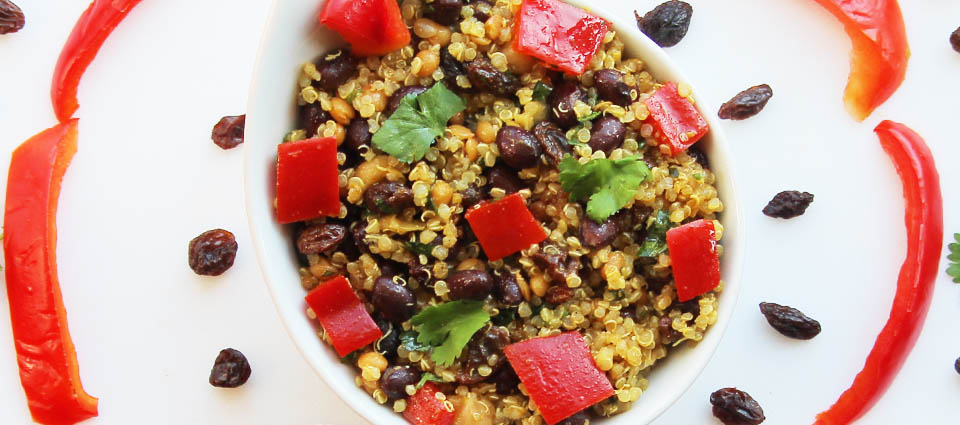 Prepare brown rice and quinoa according to directions. Mix all of the grains, legumes, raisins, vegetables and cilantro together.