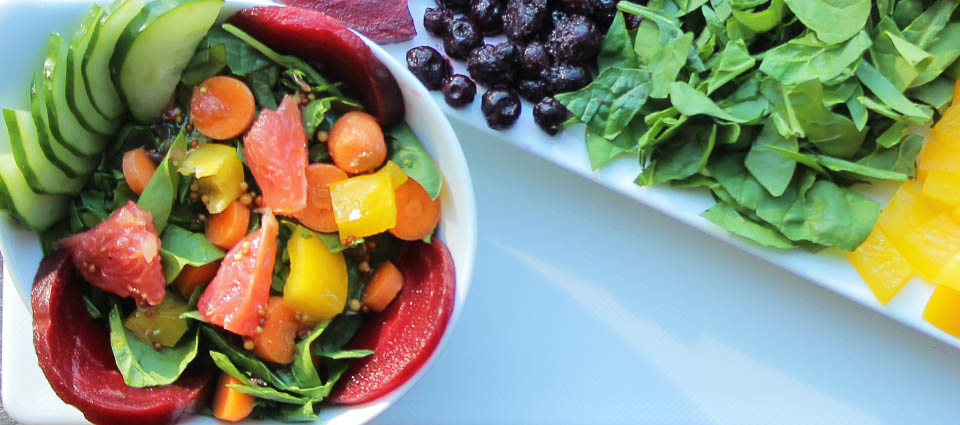 The combination of pink grapefruit sections, dark green spinach and the colours of the rainbow (and the 7 Chakras) make this delicious salad visually and texturally appealing AND of course oh so good for you! Toasted nuts & seeds give extra oomph!