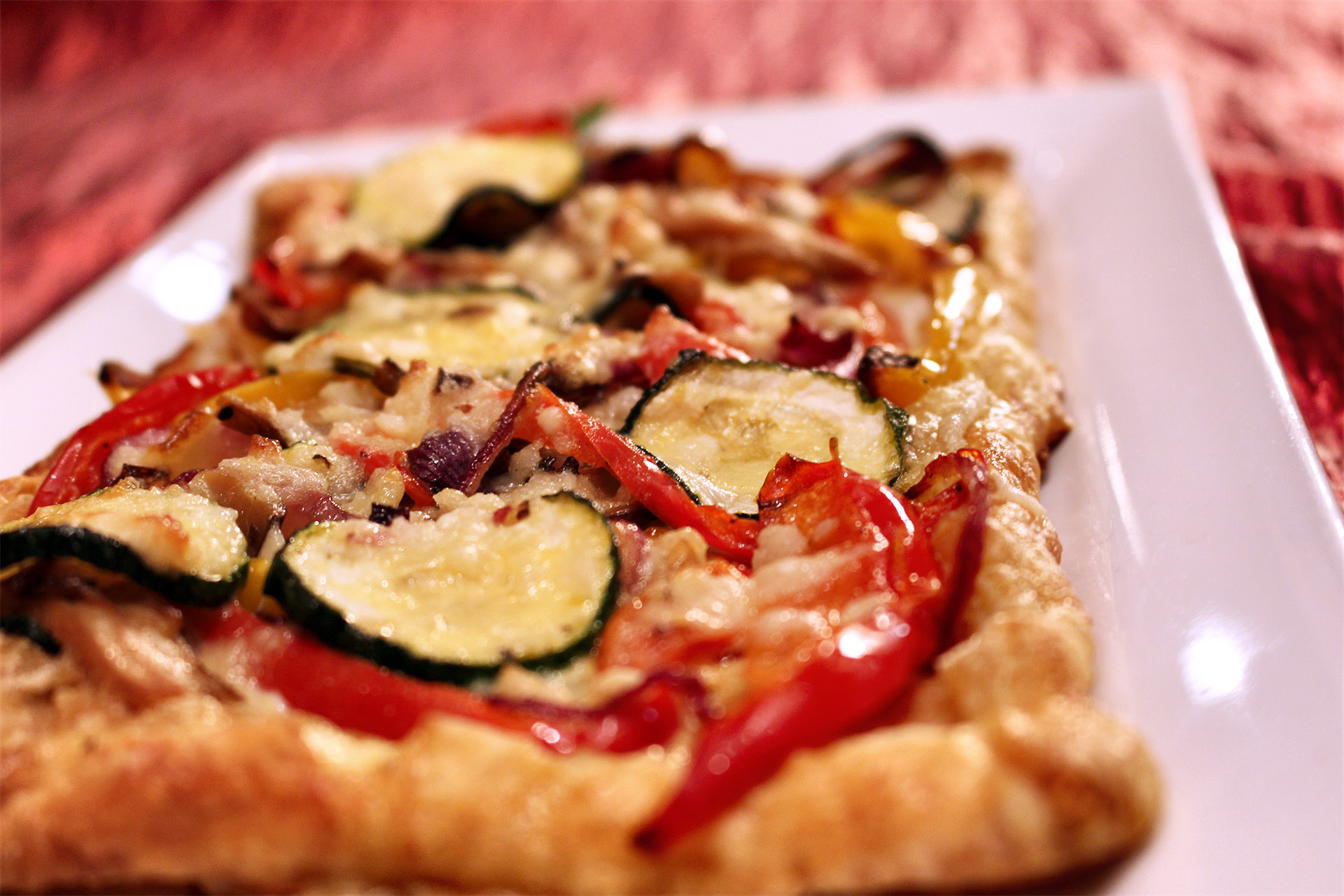 Sprinkle Gruyere cheese over the pastry, leaving a slight margin all the way around. Evenly scatter the vegetables (except the garlic) on top of the cheese. Sprinkle Parmesan cheese on top.