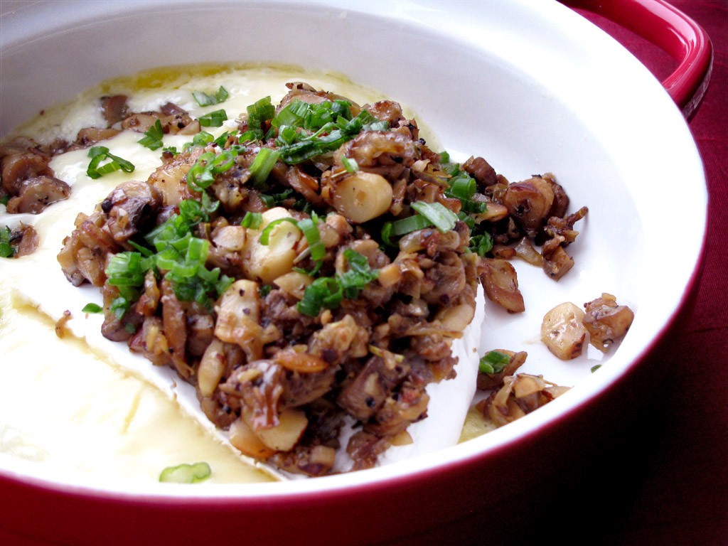 At baking time place brie on oven-proof serving plate or baking pan. Spoon the mushroom mixture evenly on top of brie.