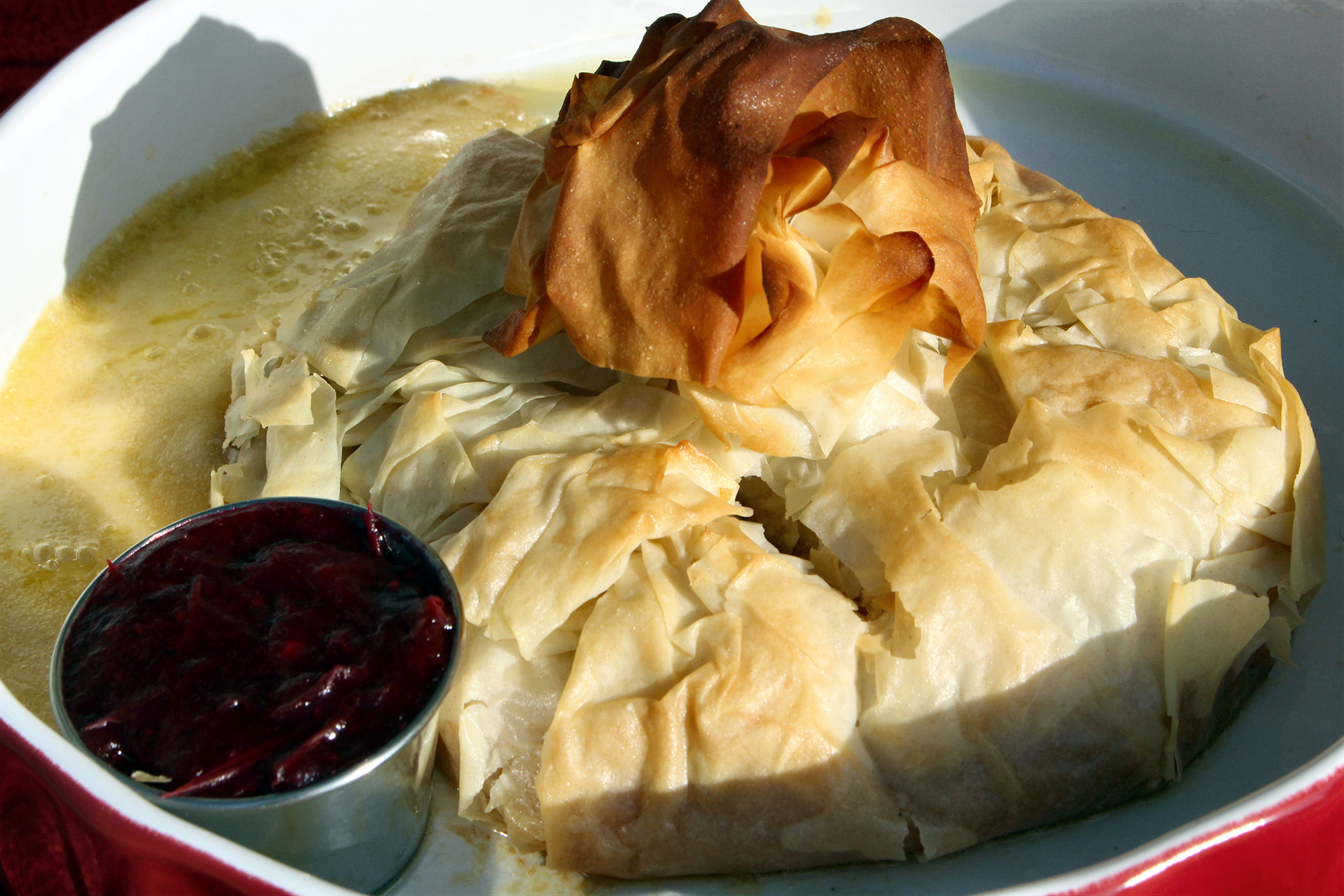 Place Brie in the centre of 10 pre-thawed sheets of phyllo pastry that have all been pre-brushed with butter (and stacked one atop the other). Place phyllo sheets into an oven-proof baking platter.