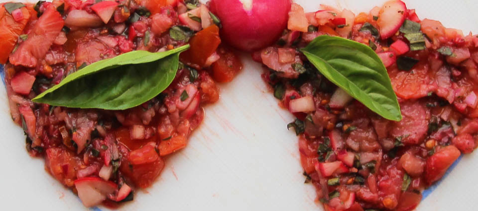 Place strawberries, cherry tomatoes, radishes, red onion, balsamic, olive oil, salt, pepper, and basil into a large glass bowl and stir gently to combine. Cover and refrigerate for 1 hour before serving to allow flavours to co-mingle. Bon appetite!