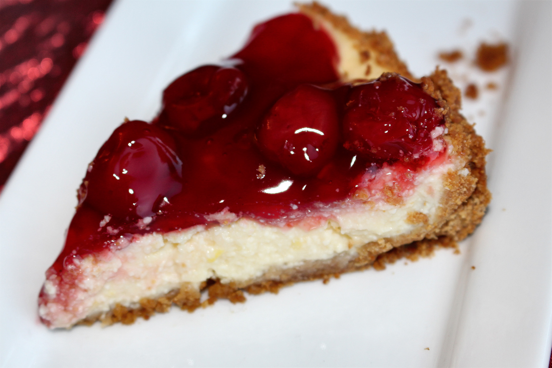 Using a spatula spread a layer of cherry pie filling over the surface. Slice the cheesecake with a thin, non-serrated knife that has been dipped in hot water.