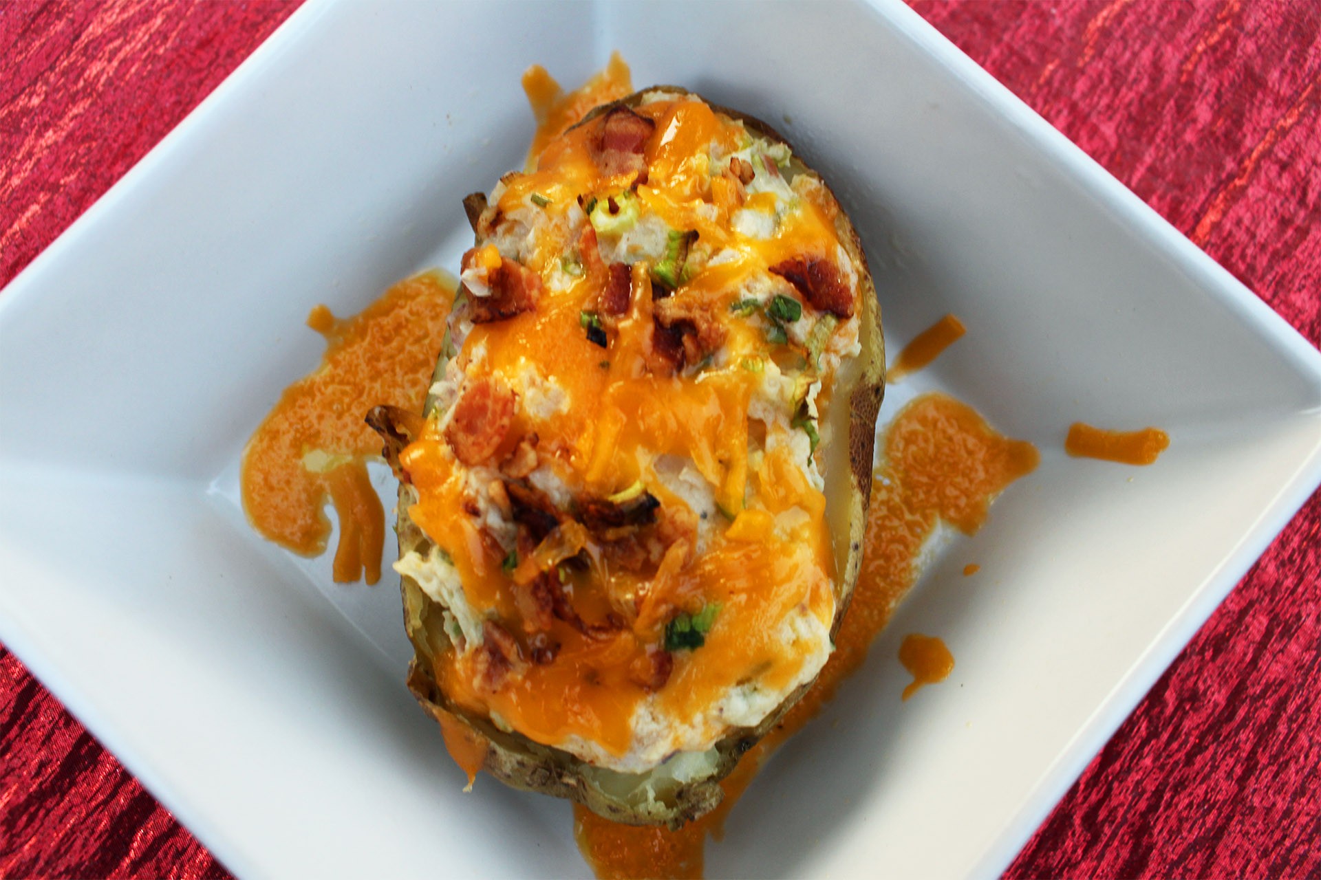Reserve some of the cheese, bacon & spring onions to sprinkle on the tops of the potatoes. Mix in the salt, pepper, cheese, bacon & spring onions with the potatoes. Top each with remaining cheese, green onions and bacon.