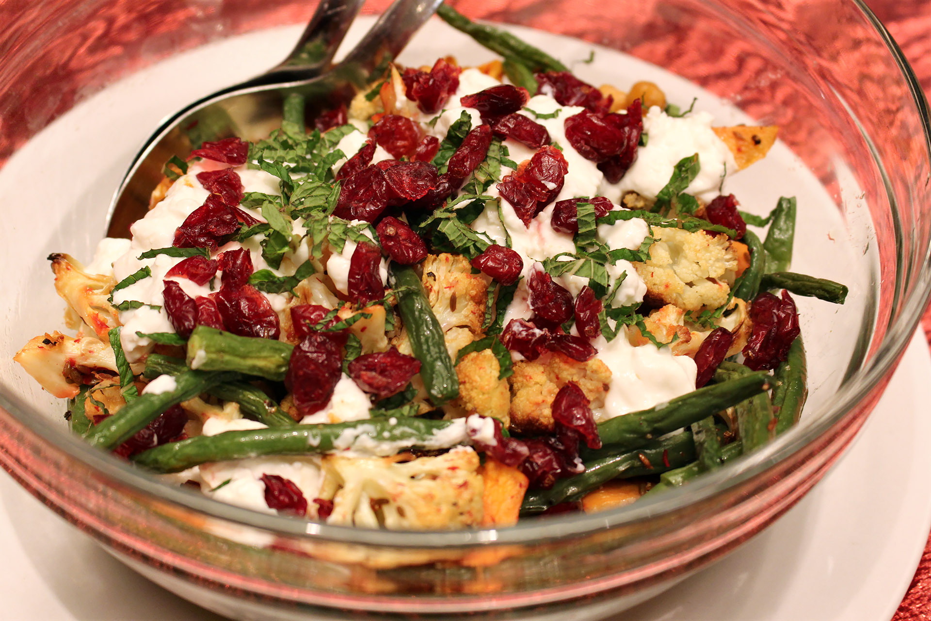 Place cauliflower, sweet potatoes, green beans and chickpeas into a large bowl and gently mix well with two serving utensils. Drizzle dressing onto roasted vegetables, then sprinkle with mint and pomegranate seeds. What a beautiful looking dish - eat immediately and enjoy.